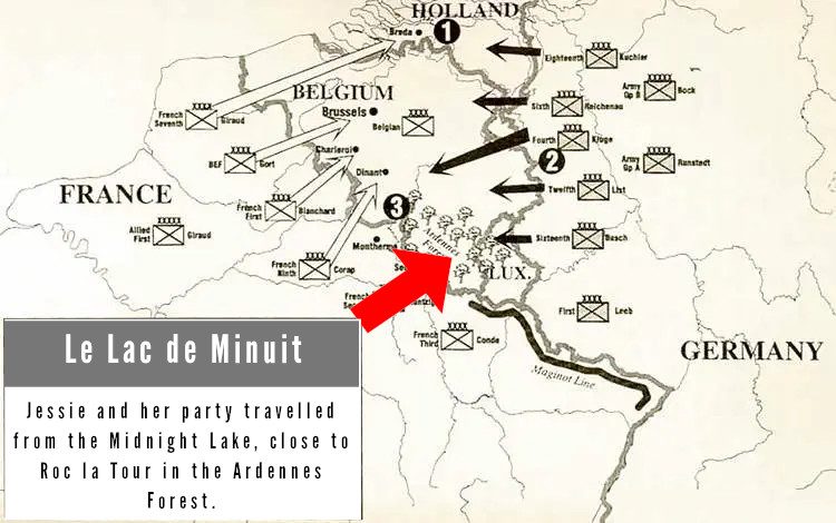 Jessie and her party travelled from the Midnight Lake, close to Roc la Tour in the Ardennes Forest, onto Rue de Rocroi, Cinq-Façons, Baileux, Chimay, Beaumont, Erquelinnes, Frameries, Tournai, Roubaix, Mons and finally, Dunkirk.